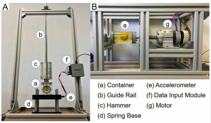 연구팀이 준비한 실험 장치는 다음과 같은것. A의 장치는, (a)의 용기에 달걀 흰자와 노른자가 들어 있으며, (c)의 추가 위에서 떨어지는 것으로 충격을 준다는 것. B의 장치는, (g)의 모터에 달걀 흰자와 노른자가 들어간 용기를 회전시키는 것으로 되어있다.