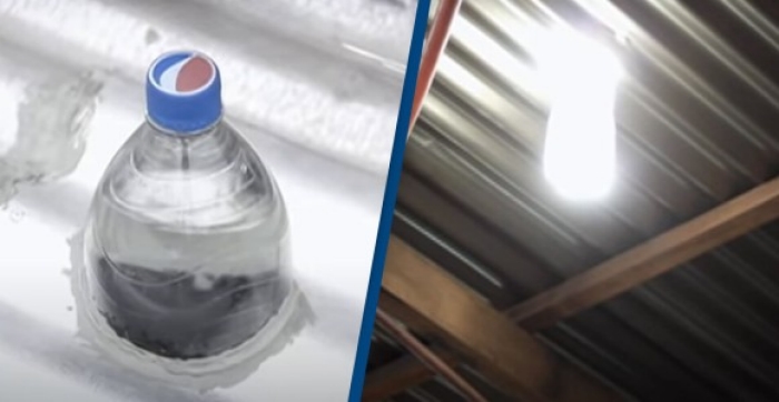 강철로 된 지붕에 물과 표백제를 넣은 페트병을 설치하면, 병의 물이 빛을 굴절시키고 방을 밝게 한다는 극히 간단한 과정이다.
