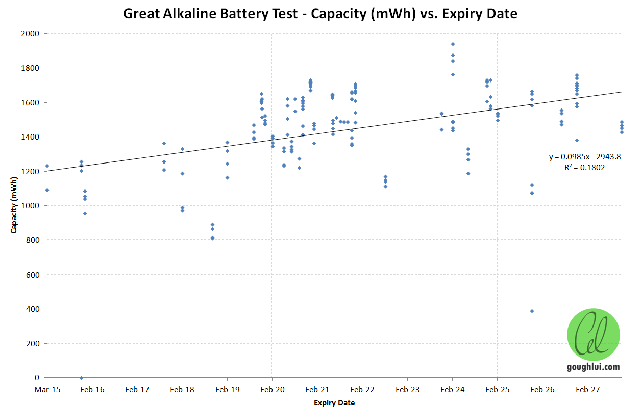마찬가지로, 밀리와트시(세로축)와 유효기간(가로축)을 취해서 "유효기한이 긴 전지일수록 좋은 전지"라는 속설을 검증한 결과가 아래. 이것에 대해서, Lui 씨는 "전브랜드의 전지의 용량과 기한을 plot 해보면, 약하면서 약간의 상관관계가 있는 것처럼도 보입니다. 그렇다고는 해도, 유효기간은 메이커에 의해서 3년부터 12년으로 변동폭이 크고, 전지에 사용되고 있는 테크놀로지도 메이커 마다 다르기 때문에, 명확한 관계가 있다고도 말할 수 없습니다"라고 지적.