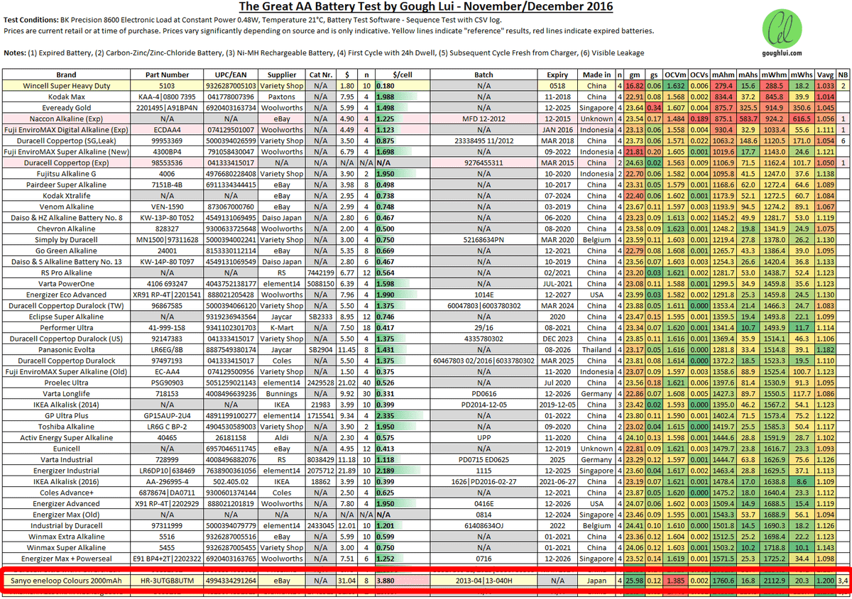 예를 들어, 테스트를 받은 전지 중 유일한 일본 제품인 산요전기의 에네루프 톤즈는, 다른 일회용 AA 알칼리 전지와는 달리, 충전식 니켈 수소 전지이므로 단순히 비교할 수는 없지만, 부하를 가하지 않은 상태의 전압인 개로전압의 평균치(OCVm)가 가장 낮은 반면, 용령(mAh)이나 밀리와트시(mWh)등은 다른 것을 압도하는 성적이었다.