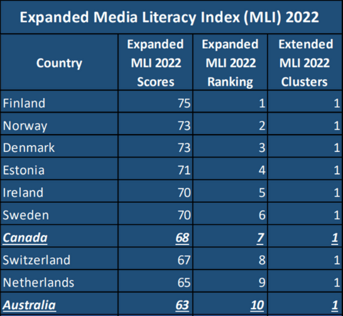 다음은, 이번 리포트에서 가장 성적이 좋았던 상위 10개국의 "클러스터 1" 순위로, 핀란드가 100점 만점에 75점을 받아 1위를 차지했고, 2위에 노르웨이, 3위에 덴마크가 랭크돼, 북유럽 국가들이 상위권을 차지하는 결과를 보였다. 특히 핀란드에서는 가짜 뉴스나 오정보를 분별하는 방법이, 학교 교육에 포함되어 있어 선두 자리에 올라 있는 것도 납득이 가고, 또 유럽 이외에서는 캐나다가 7위, 호주가 10위를 차지.