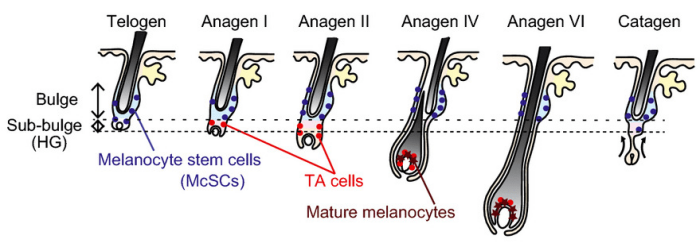 TA 세포는, 멜라노사이트와 멜라노사이트 줄기세포의 중간 상태와 같은 형태이지만, 보통 줄기세포는 TA 세포가 되면 원래대로 돌아갈 수 없다. 한편, 멜라노사이트 줄기세포는 발육 중인 모낭 속을 이동하는 과정에서 다양한 신호가 되는 단백질에 노출됨으로써, 줄기세포와 TA세포 사이를 오갈 수 있다는 것. 그러나 모낭 벌지에서 움직일 수 없게 된 멜라노사이트 줄기세포는, 이 사이클에서 분리되기 때문에 멜라노사이트를 공급할 수 없게 되어 버린다.